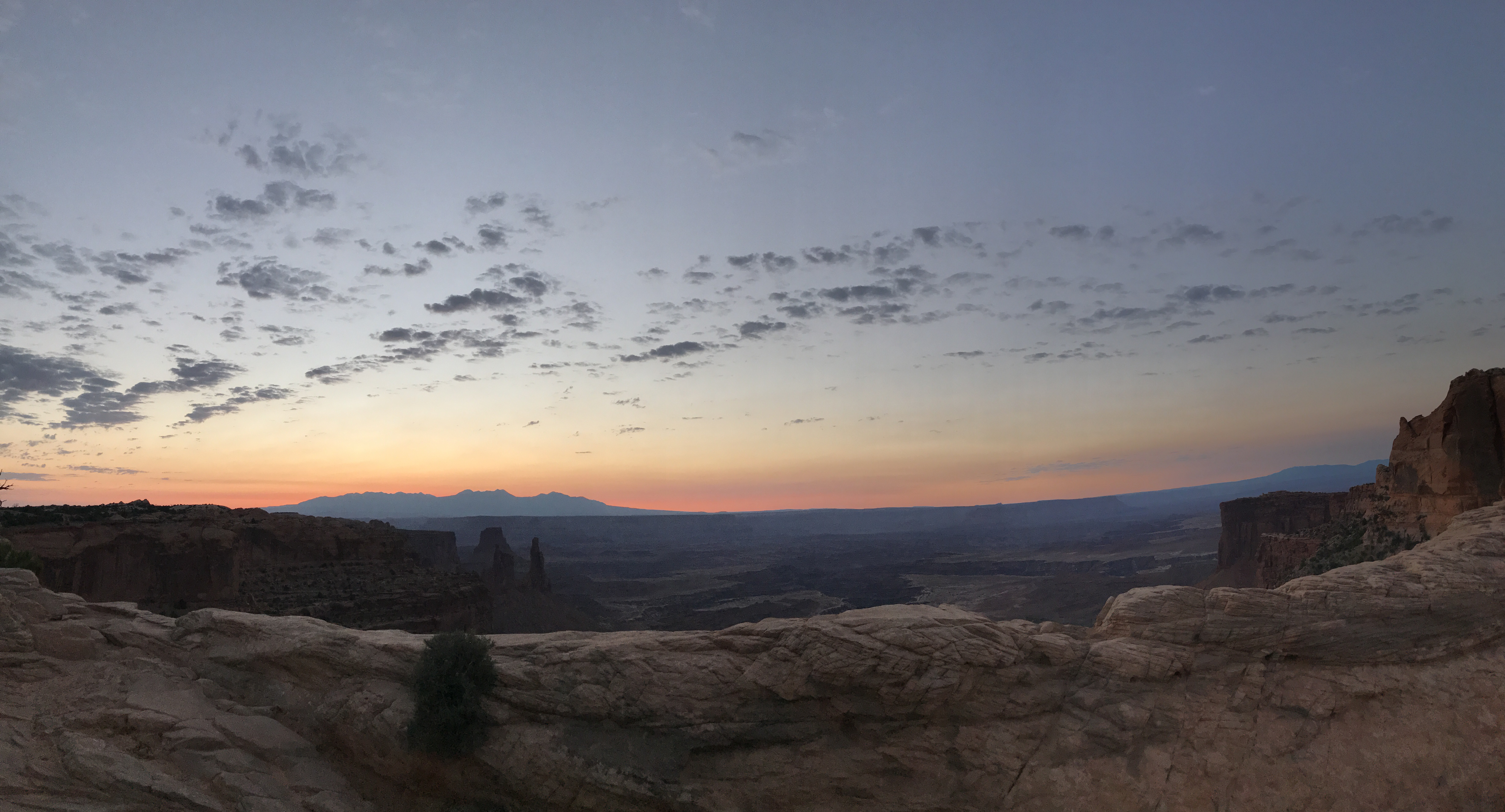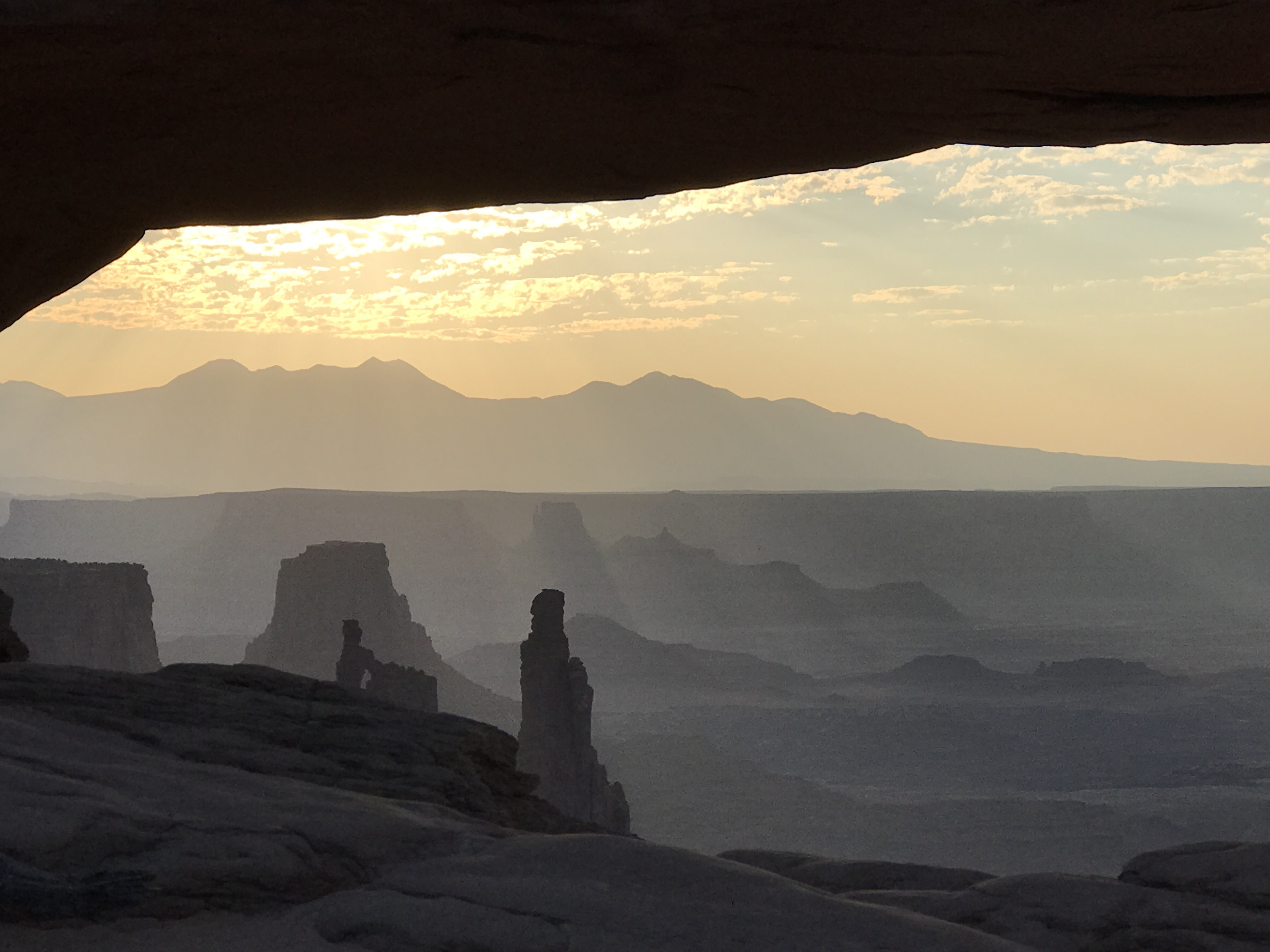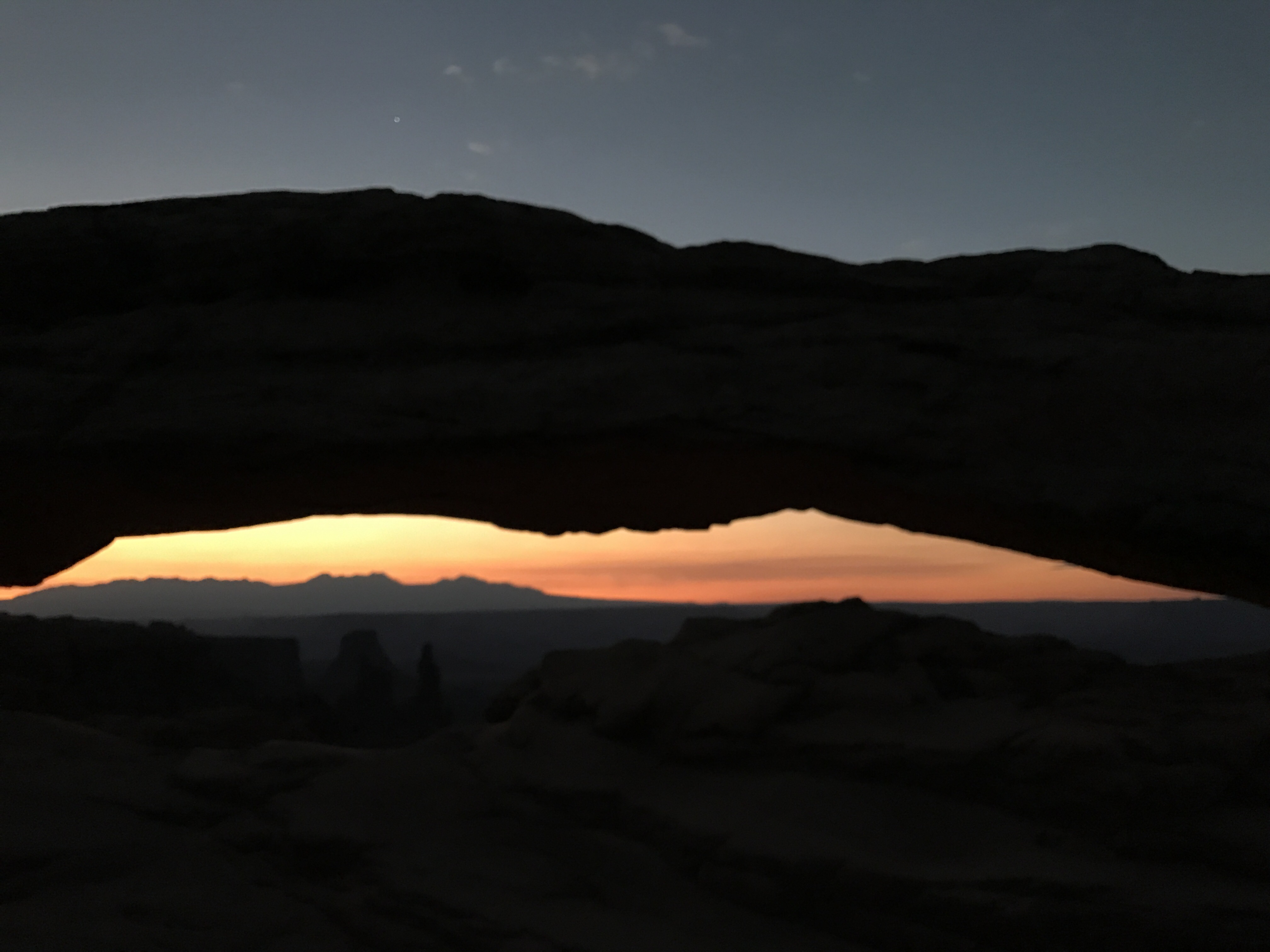 Mesa Arch was much smaller and friendlier-looking than Delicate Arch, but the backside was a steep cliff that gave way to a gaping pit. More pinnacles and buttes could be seen in the distance, and even further were the La Sal mountains. The sky was lightening rapidly. In only fifteen minutes it had turned from black to grayish navy.