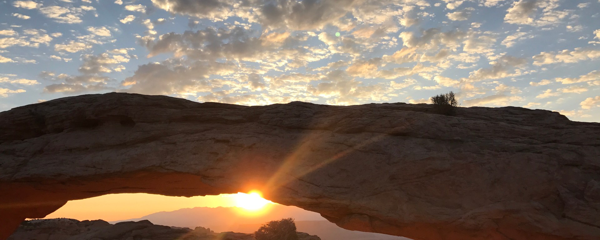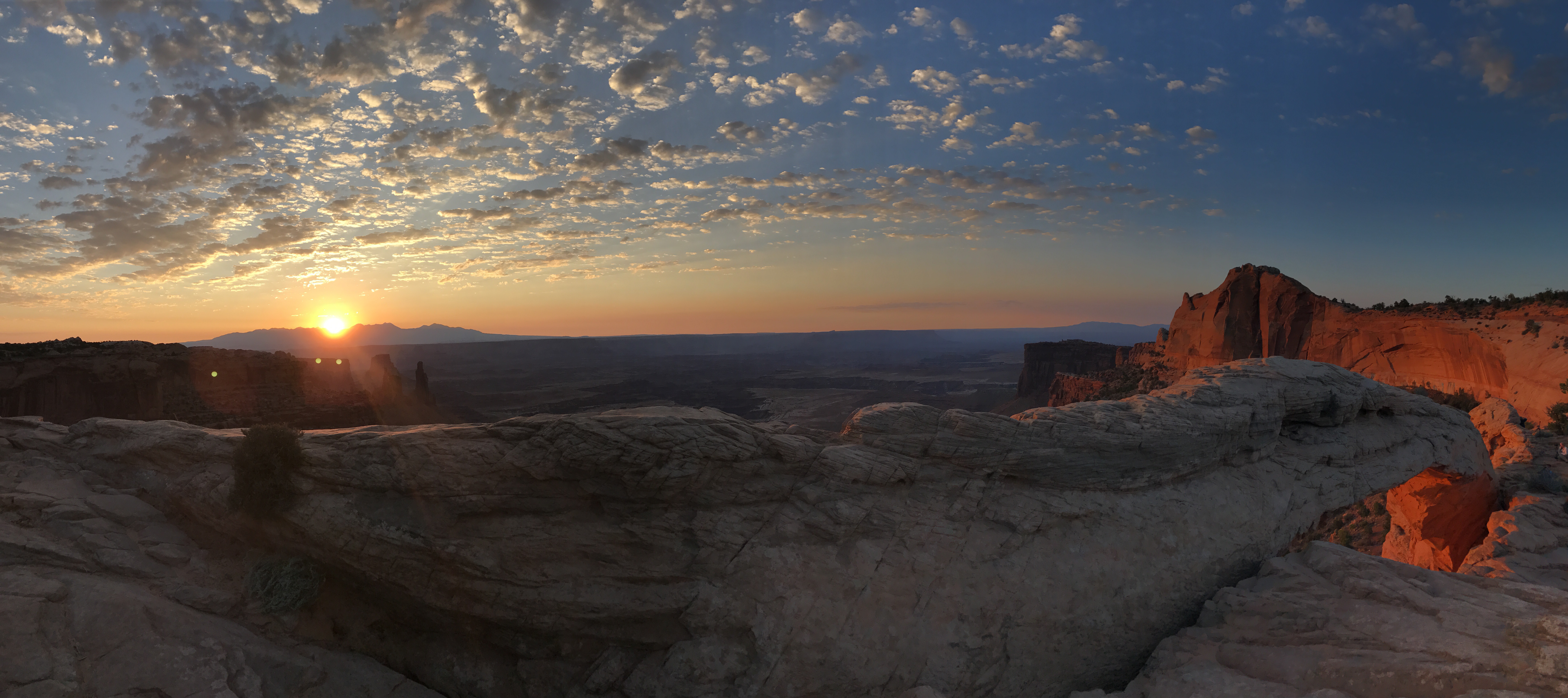 You could easily miss the beginning of the sunrise if you looked away for an instant, or sneezed, or blew your nose, or anything. In a split second the sun peeked from behind the La Sal mountains, and quickly inched above them. I could hear a collective gasp from all the viewers, and the rate of camera clicks quickly intensified.