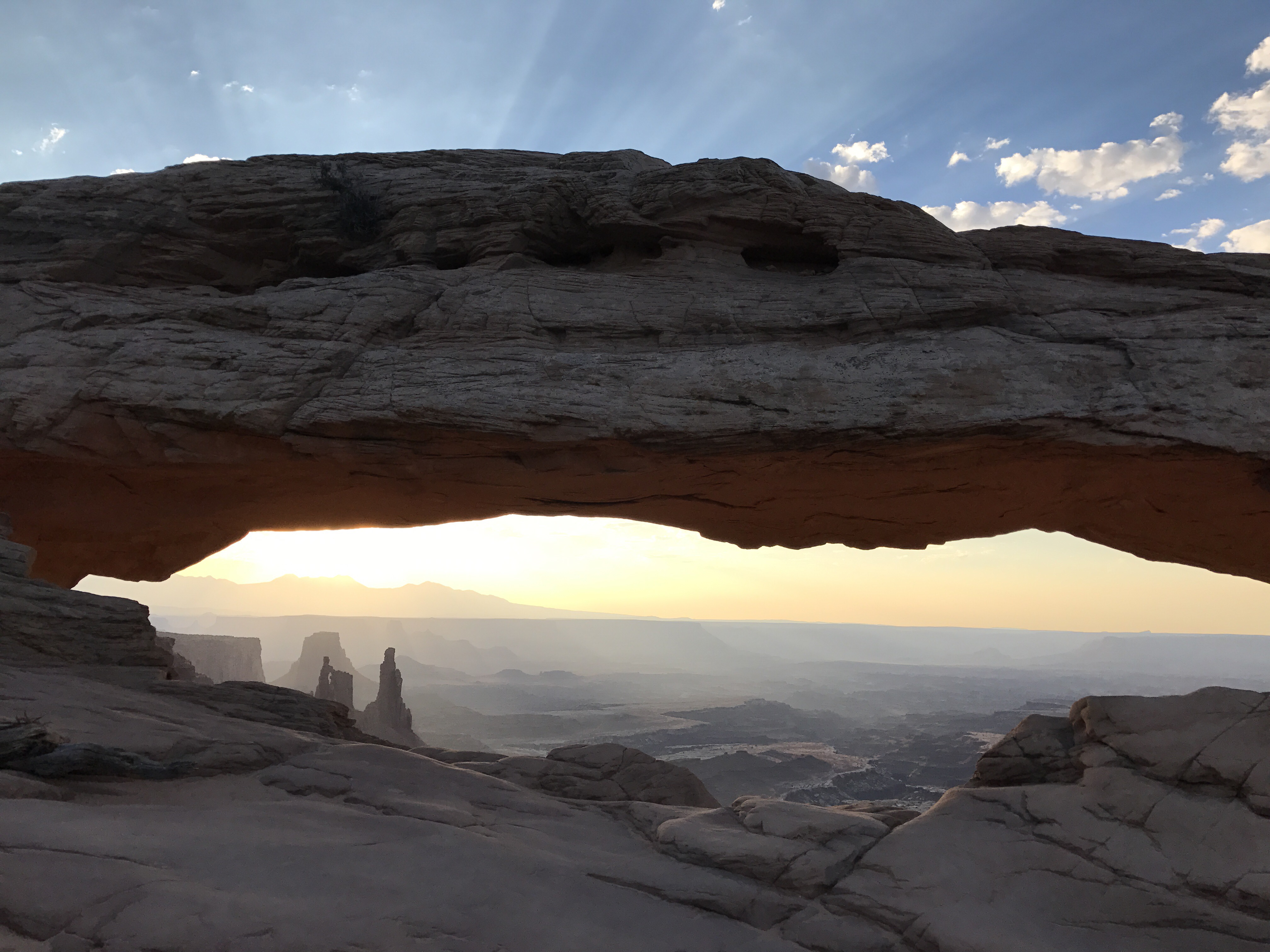 The road to Mesa Arch was pitch dark and very lonely, but the parking lot was surprisingly already filled with cars. We had to hike to the Arch, but the hike was only eight minutes and mostly sand and pavement, with a few slippery rocks.