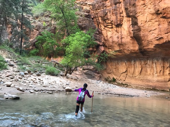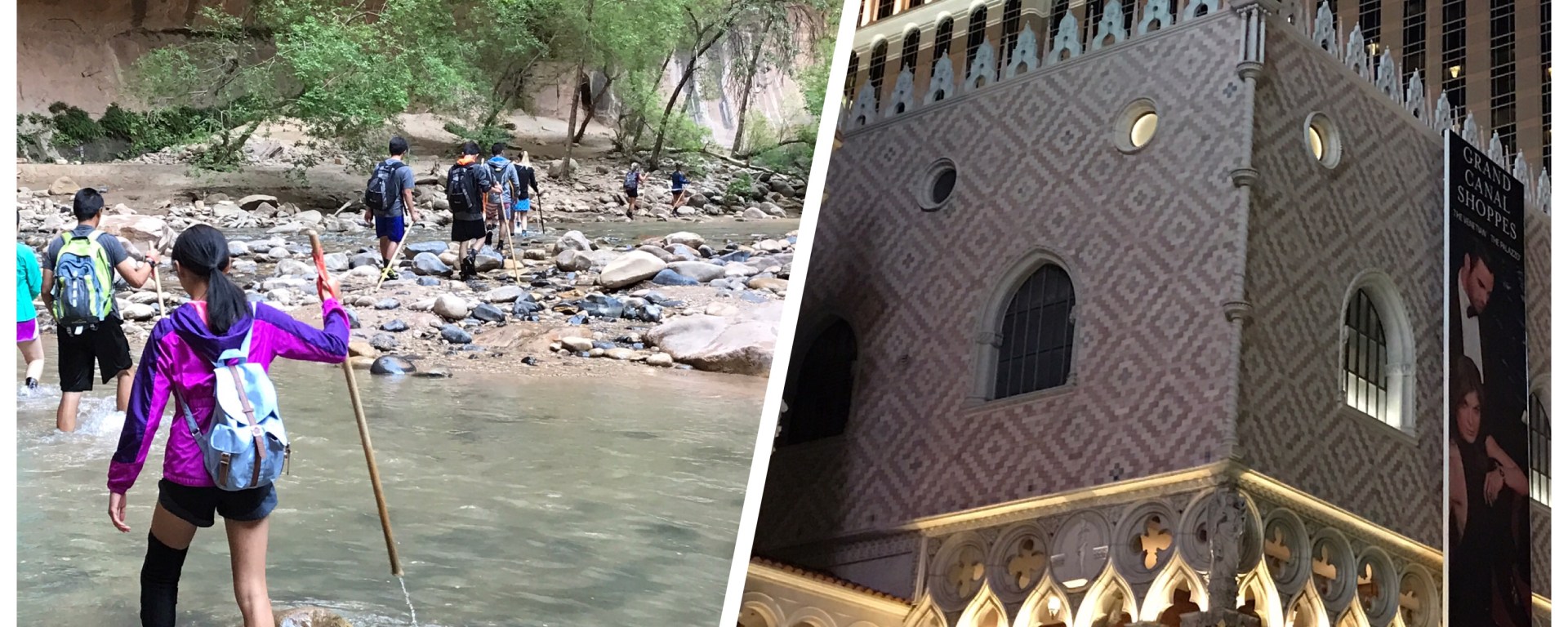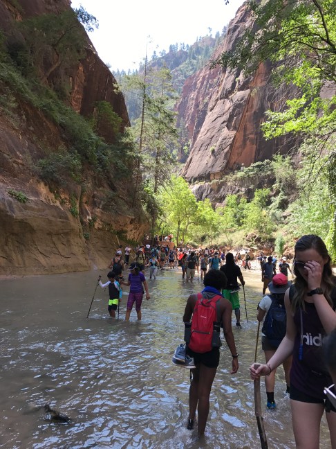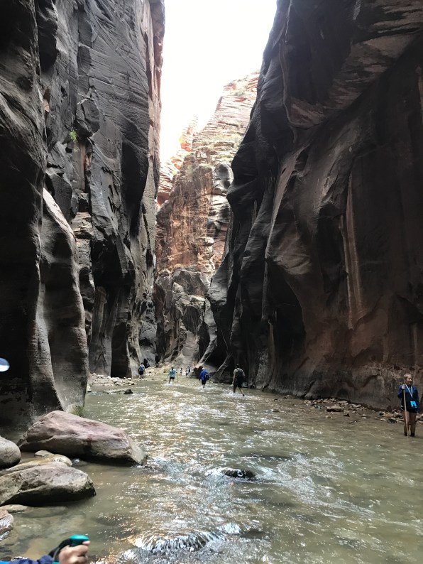 Today was a day of extreme contrasts. We began the day bright and early at Zion National Park to hike the Narrows and ended the day in Las Vegas. Now the Narrows was probably the most adventurous thing we’ve done on this vacation. The trail isn’t even a path of dirt or rocks; the trail IS the Virgin River. We had to wade against the cool current, with rocks surrounding us on both sides like a fortress. You couldn’t see the river bottom even though it was only knee-deep because the current churns the water into white foam, so we navigated using our hiking sticks. The riverbed was stacked with uneven rocks but gave way to smooth sand at times. After what seemed like four miles (it was probably only one mile, considering how slow upstream we had to hike) we ended our hike in a place called Wall Street. It was a wall of smooth black rock towering above us, hence the name “Wall.” It felt as if the walls were closing in!